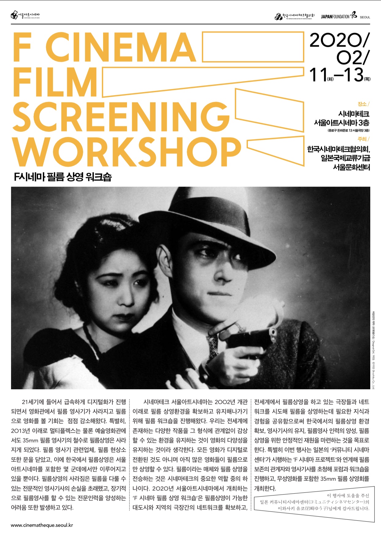 21세기에 들어서 급속하게 디지털화가 진행되면서 영화관에서 필름 영사기가 사라지고 필름으로 영화를 볼 기회는 점점 감소해왔습니다. 특별히, 2013년 이래로 멀티플렉스는 물론 예술영화관에서도 35미리 필름 영사기의 철수로 필름상영은 사라지게 되었습니다. 필름 영사기 관련업체, 필름 현상소 또한 문을 닫았고, 이에 한국에서 필름상영은 서울아트시네마를 포함한 몇 군데에서만 이루어지고 있을 뿐입니다. 필름상영의 사라짐은 필름을 다룰 수 있는 전문적인 영사기사의 손실을 초래했고, 장기적으로 필름영사를 할 수 있는 전문인력을 양성하는 어려움 또한 발생하고 있습니다...2020년 서울아트시네마에서 개최하는 ‘F 시네마 필름 상영 워크숍’은 필름상영이 가능한 대도시와 지역의 극장간의 네트워크를 확보하고, 전세계에서 필름상영을 하고 있는 극장들과 네트워크를 시도해 필름을 상영하는데 필요한 지식과 경험을 공유함으로써 한국에서의 필름상영 환경 확보, 영사기사의 유지, 필름영사 인력의 양성, 필름 상영을 위한 안정적인 재원을 마련하는 것을 목표로 합니다. 특별히 이번 행사는 일본의 ‘커뮤니티 시네마 센터’가 시행하는 ‘F 시네마 프로젝트’와 연계해 필름 보존의 관계자와 영사기사를 초청해 포럼과 워크숍을 진행하고, 무성영화를 포함한 35mm 필름 상영회를 개최합니다.