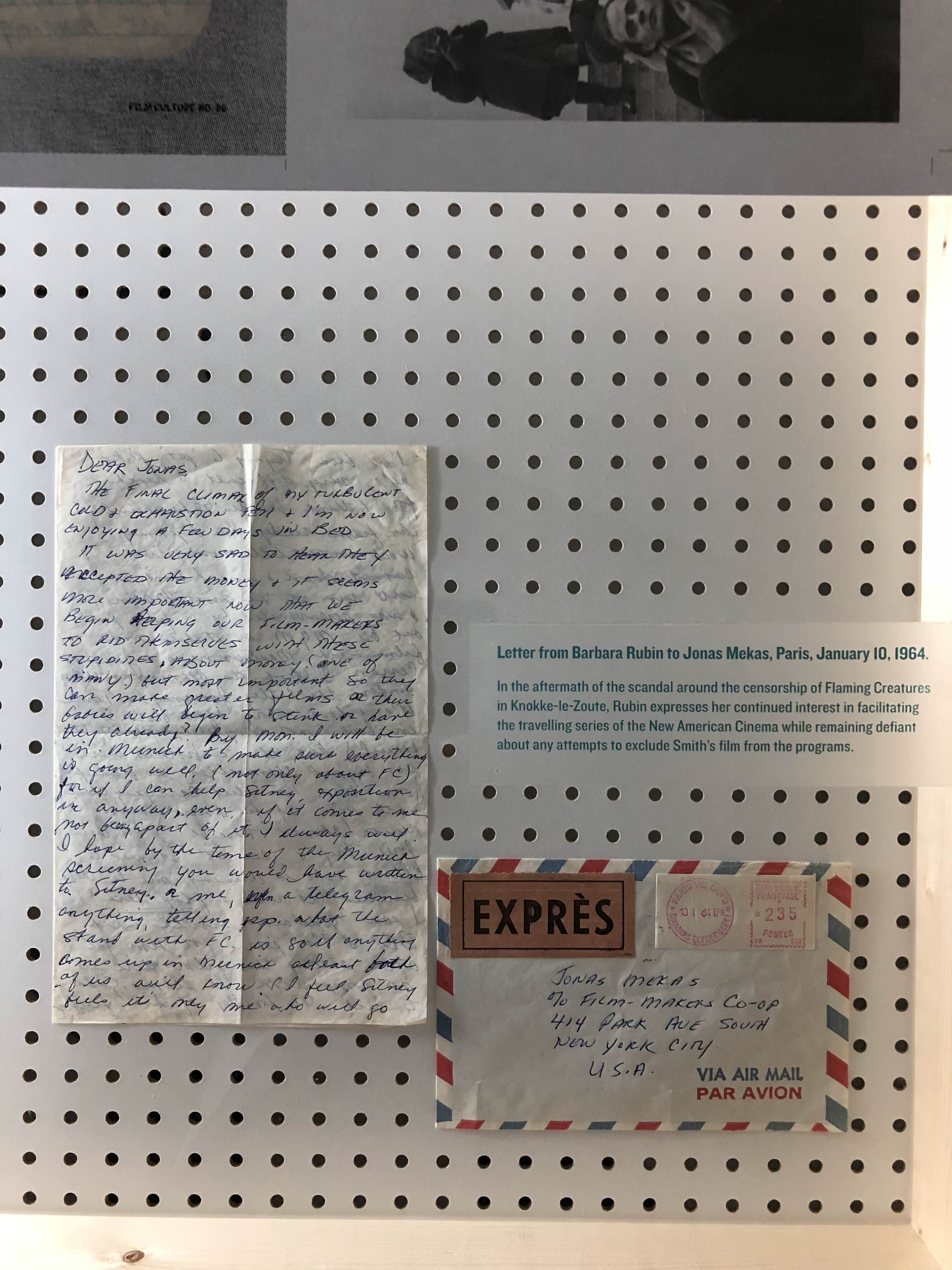 이미 며칠 전에는 베딩에 있는 ‘사일런트 그린’에서 필름 컬처 잡지의 역사를 볼 수 있는 사진, 잡지, 편지 등과 셜리 클라크, 마야 데렌, 앤디 워홀, 그리고 전설적인 바바라 루빈의 작품을 상영하는 전시회가 열렸다. 바바라 루빈이 요나스 메카스에게 보낸 편지들, 그리고 요나스 메카스가 마틴 스콜세지 등과 나눈 필름컬처를 운영하기 위해 후원금을 요청하는 서한들, 피터 보그다노비치의 후원에 감사하는 편지들이 눈길을 끌었다. 전시장 구석에서는 바바라 루빈의 첫 단편 제작에 깊은 영향을 주었던 잭 스미스의 ‘황홀한 피조물들’이 상영되고 있었다.