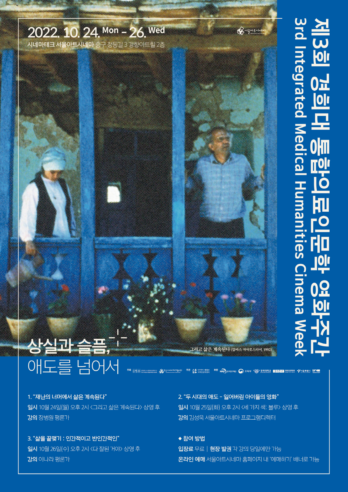 코로나 이후 상실의 경험은 피할 수 없는 일이 되었습니다. 때론 사랑하는 이들과의 이별을, 때로는 자신이 해오던 일의 중단을, 혹은 사람과 사람 사이의 관계의 단절을, 혹은 평범한 일상의 상실을 마주합니다. 탄식과 슬픔이 넘쳐나지만 과거 사랑하는 이를 떠나 보내던 애도의 과정도 팬데믹 이후에는 쉽지 않은 일이 되었습니다. 이 복합적인 상실의 경험을 넘어서기 위해서는 여전히 많은 시간이 필요해 보입니다. 하지만, 우리의 삶은 이런 상실과 함께 진전하지 않을 수 없습니다. 이번에 선택한 세 편의 영화는 그런 복합적인 상실의 경험과 마주해 애도의 과정을 협상하는 사람들의 감정적 여정을 그립니다. 우리는 죽음을 넘어 여전히 지속되는 삶, 불가능한 애도와 더 이상 존재하지 않는 이의 흔적과 마주하는 상실, 그리고 삶을 끝내는 방식과 관련한 질문과 마주하게 될 것입니다. 상영 후에 이어지는 세 번의 강의는 이런 곤혹스러운 문제에 대한 생각의 기회와 대화의 공간을 제공할 것입니다.