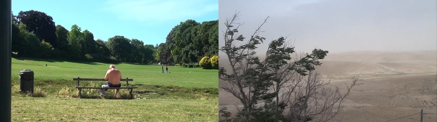거센 바람에 나무가 흔들리고 있다. 그 뒤편으로는 저 멀리 사막처럼 보이는 대지가 펼쳐져 있다. 그런데 여기는 어디일까? 아직 우리는 이곳이 어디인지 알지 못한다. 어느 정도의 시간이 흘렀을까, 화면은 이제 바뀌어 공원에서 상의를 탈의하고 벤치에 있는 한 남자의 뒷모습이 보인다. 화면 앞으로 사람들이 지나가고 있다. 예의 그 남자는 그저 야외 공원에서 우연히 포착된 사람일 것이다. 아니면, 어떤 의도가 그를 화면 안에 끌어들인 것인지도 모른다. 혹은 이전의 장면과 어떤 연결을 이루고 있을 수도 있다. 우리는 바람에 흔들리는 나무를 보고 있었고, 이때 그 화면의 세계에서 다른 이들은 없었다. 이때 다른 사람들이 나타난다. 이를 두고 사르트르가 말했던 나의 세계에 발생한 ‘내출혈’이라 부를 수도 있겠다. 타자의 출현은 나의 세계에 생긴 작은 균열 같은 것이다. 다음 숏에서 우리는 어느 집의 정원을 내려다보는 위치에 있다. 저 아래 정원의 한 가운데에는 해변의자가 놓여 있다. 이어 카메라는 한 여인이 문을 열고 거실을 돌아다니는 장면을 보여준다. 그녀는 정면을 향해 친근하게 말을 건넨다. 이어 부엌의 탁자에 앉은 두 여인이 식사를 하며, 결코 특별하다 할 수 없는 말들을 나누는 장면이 이어진다. 그들은 감자가 맛있다거나, 모든 비타민이 껍질에 들어있다거나, 등의 식탁에서 오갈법한 이런저런 이야기를 나누고 있다. 이들이 누구이지 깨닫게 되는 것은 나중의 일이다.