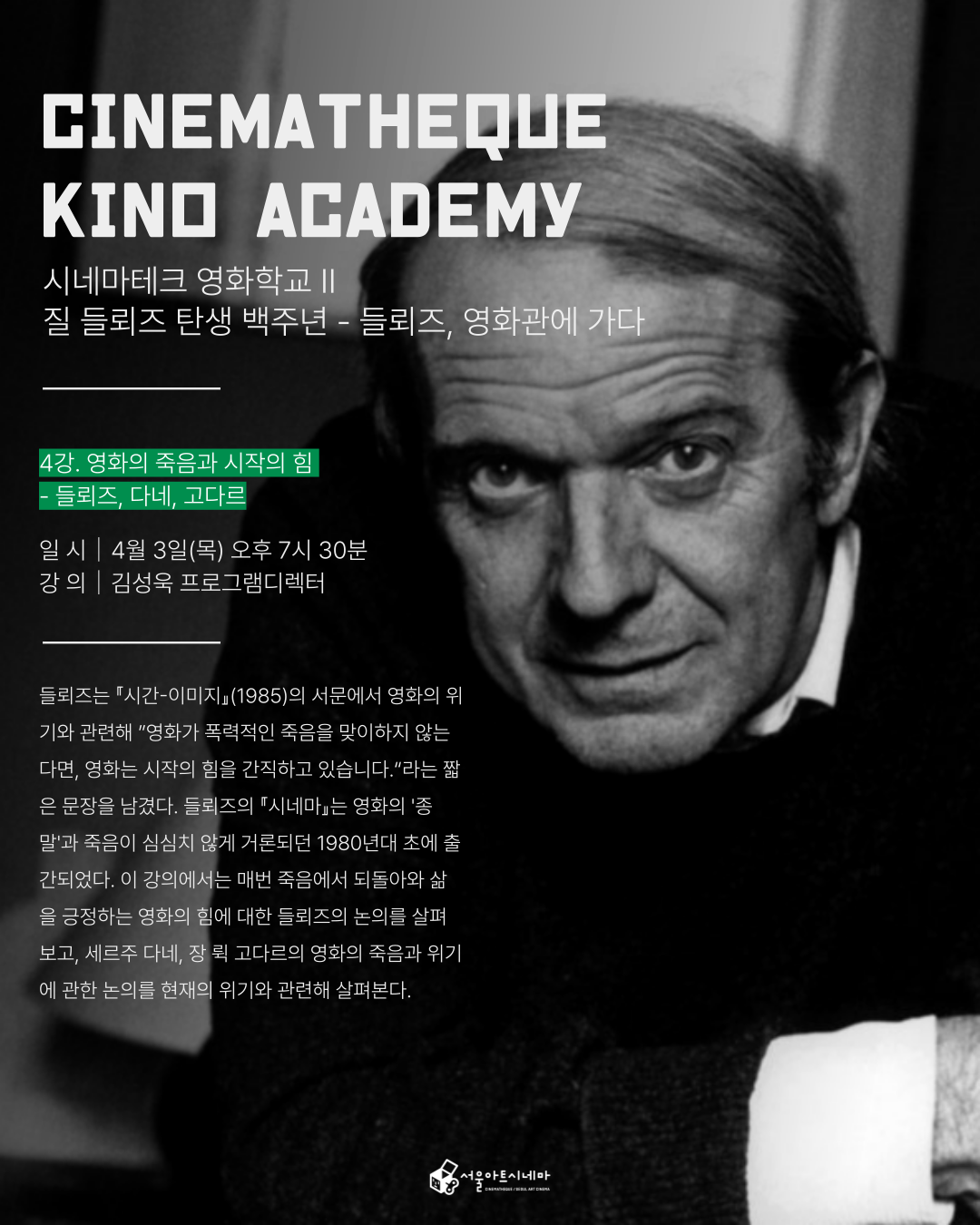 ‘들뢰즈, 영화관에 가다’의 마지막 강의는 『시간-이미지』(1985)의 영어판 서문(1988)에 실린 짧은 문장으로 시작할 것이다. 그 문장은 이렇다: “영화의 죽음에 대해 이야기하는 것은 어리석은 일입니다.”